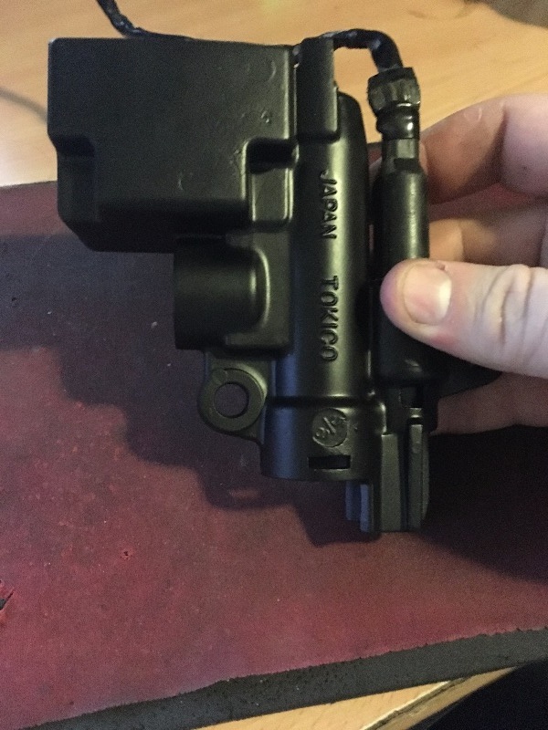 So being optimistic I took the better of the two and used the original piston after some polishing to seem if it wouldn't leak. I rigged it up to a GPZ900r Caliper with some brake line from a Gt550, and it held pressure, regrettably I found out why this cylinder was spare parts the piston was worn or at least the seals.
