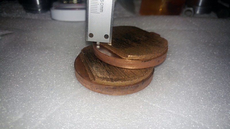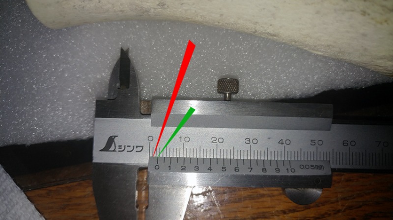 The red arrow shows the service limit of 1 mm (the thickness of the stepped portion). Mine are where the green arrow points (2.5 mm) - well within the limit. I might later buy brand new pads, but for now these will work fine.