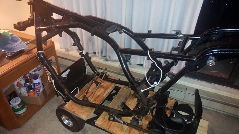 The bike made it home. The frame is stripped and waiting for me to sand blast it and take it for powder coating. The triple tree is off since this photo as well.