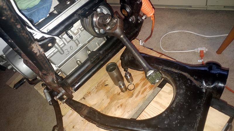 8 years 2 months agoThe other side was harder at the beginning. The swing arm was loose and there was more space to play. It was safe at this stage to hammer the pivot inside the frame. Once I saw it coming out towards the center of the bike, I applied more Kroil, applied pressure from the bolt/washer and tapped it from the inside using a long steel rod I purchased from Home Depot. The pivot came out after a couple back and forth and slid out easily.
