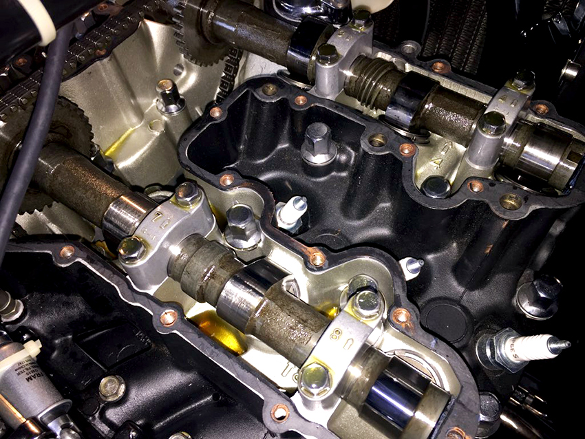 What else... Oh, that's right! Removed the cam cover! Things look shiny and clean. I am very happy. A peek inside the engine showed more of the same. I am very happy and that's an understatement. Of course, the whole purpose was to re-torque the cylinder head nuts. Applied the 29 lbs./ft. to the main nuts in the sequence per manual three times, and the required torque for the four smaller 10 mm bolts, until nothing moved. I didn't measure the exact numbers, but if someone wants to take a note for reference, all main nuts turned about 15 - 20 degrees.