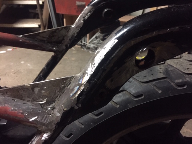 I would suggest that you consider extending the original gussets on the inner radius possibly 3" past the lower intersection point of the new frame rails. That way the gussets will be under tension which would be preferred. (For simple engineering explanation, consider that the original gussets did exactly that supporting the radius of the tail section frame). By extending the original gussets past the bottom intersection of your new seat rails you've dissipated the forces over a larger area giving more of the frame an opportunity to support the stress.