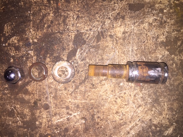 I have also taken off all the fasteners that Stan wants and lastly I have managed to take out one shock mount. It is indeed a bus that is stuck through the frame and welded on both sides. The actual shock mount pin is inserted into the bus somehow - I cannot get that out, but as it stands I can simply drill a new hole where I want it, stick the bus back into the frame and weld it again on both sides.