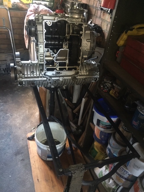 Attached pics of the engine on its side on the table frame, on a plank on wheels... The benefit of teh frame being that I can turn the engine over without having to remove the cylinder studs (which I can't get out).