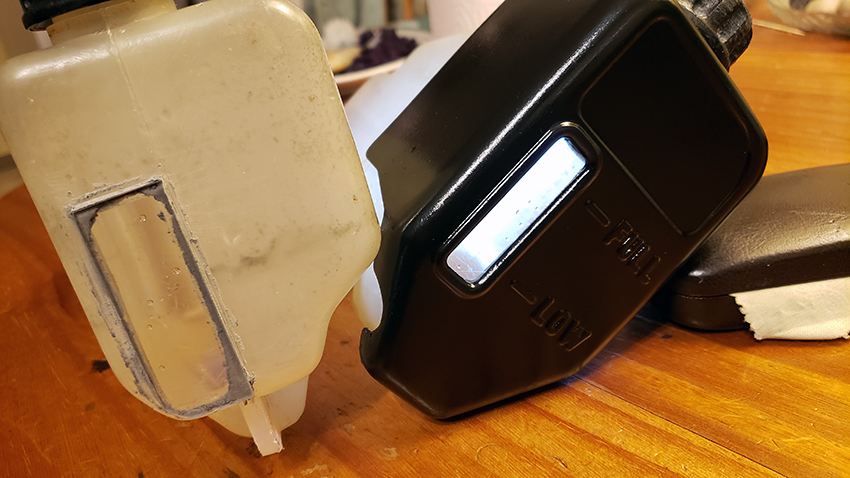 The brittle areas are being cut out and covered with fresh clear polycarbonate, bonded with JB Weld. It works great! I have done that on my first bike and no problems. As expected. Having a real clear plastic in the view window is great as well for change - you can truly see the level and color of the coolant.