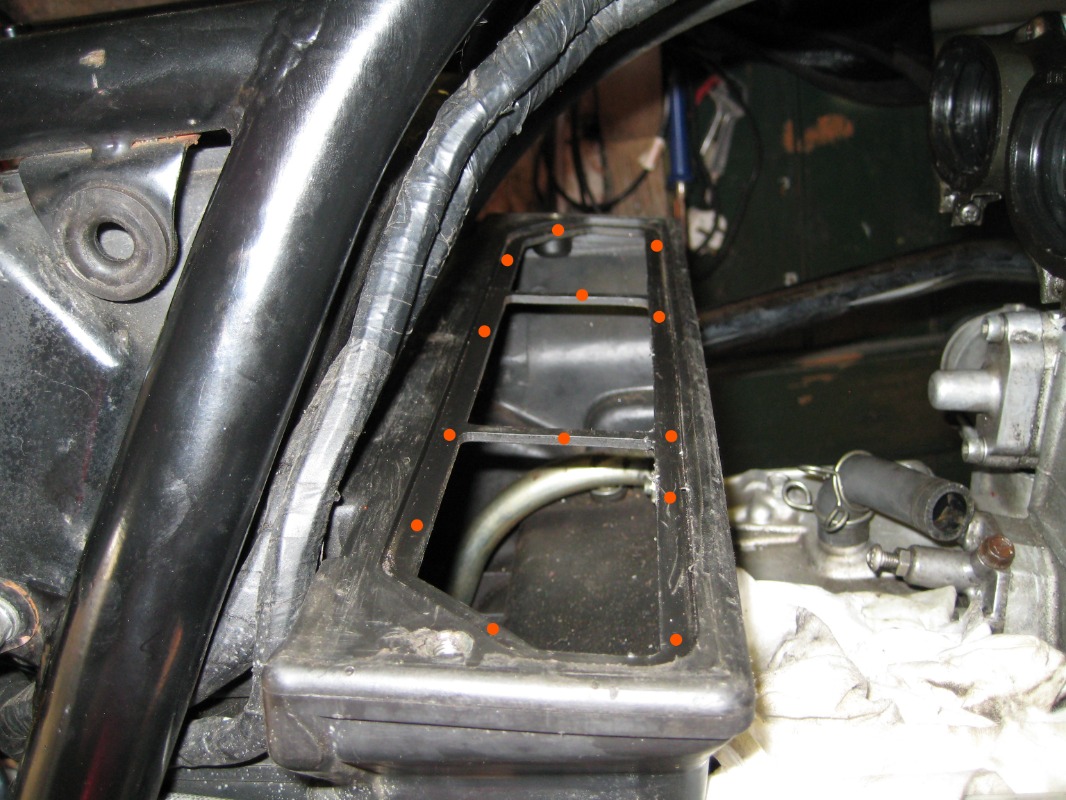 I was investigating Zed_13s suggestion regarding the crankcase breather and I may have found the possible cause for debris getting into crankcase. The airbox is in two parts with a rubber gasket glued to a thin metal frame sandwiched between them. The gasket sits in a recess in the lower part of the airbox. The rubber part on mine had come adrift from the metal frame, leaving quite a bit of space for rubbish to get drawn in. The bottom of the airbox was a bit gritty as well. I’ve marked on the photo where the gasket sits.
