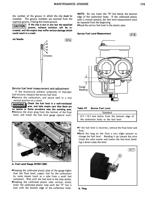 The reference for setting the float height is a little difficult to find. There's a section on rebuilding the carbs starting on pg 49 and that section refers to pg 170 for setting the "Service Fuel Measurement"