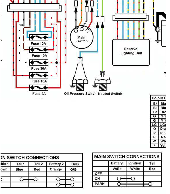 When the Main Switch is selected to "Park" the white wire with black stripe is only connected to the red wire to supply power to the tail light for parking the bike at night.