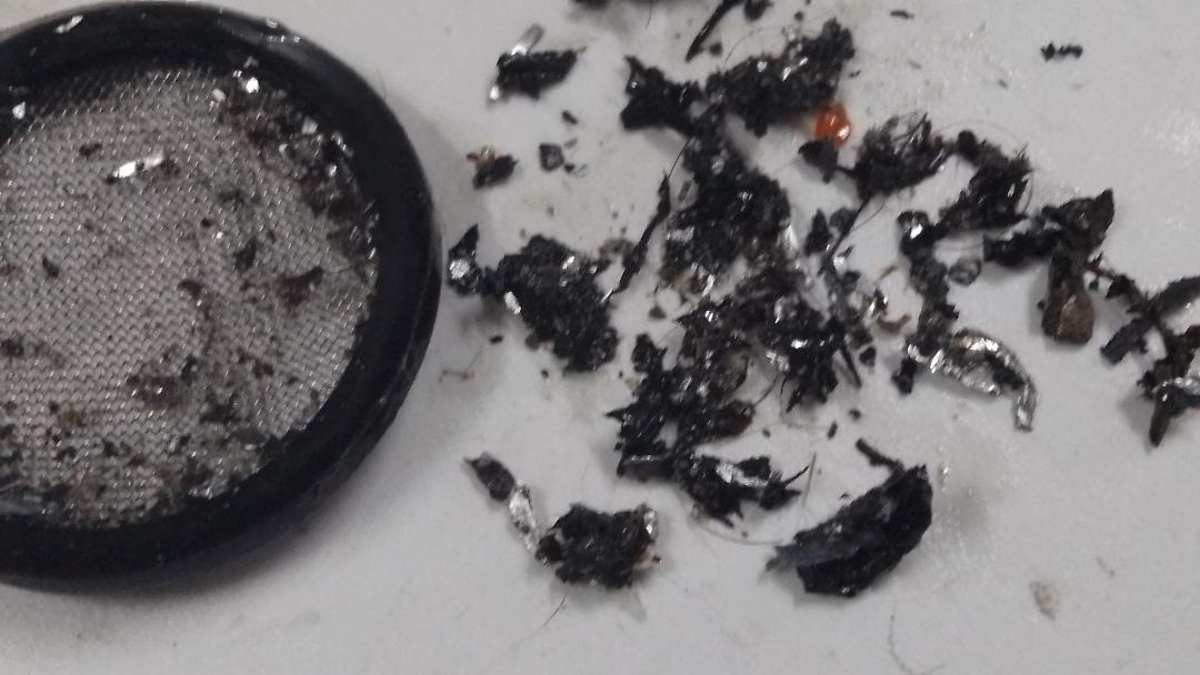 The filter was filled with silver flakes and black silicone gasket residue.
