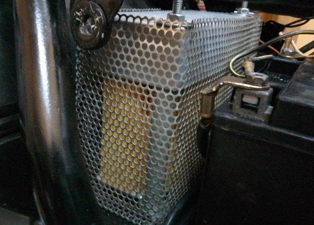 I took a holey mesh from a used tractor air filter, folded it into a box to hold the original filter, and put a lid on it while waiting to find a piece of sheet metal to make the toolbox.