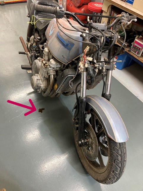 Regardless of the condition of the motorcycle or the missing parts, I think you'd be able to rebuild it from the oil stain. Congratulations.