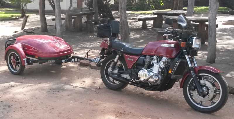 I recently made a trailer for my bike from a Thule roof box. I used KZ440 16" rear rims to match my Z13 rims and Yamaha 125 rear suspension units on the independent swing arms. I had a 360 deg swivel hitch attachment made and a stainless steel cowling around the radiator to collect more air. I rode the unit from Bulawayo up to the Victoria Falls this weekend (a 900km round trip) and both bike and trailer went like a dream at a constant 120km/h. Handling was excellent and didn't know the trailer was behind me most of the trip. I am well pleased and more excursions are now on the cards