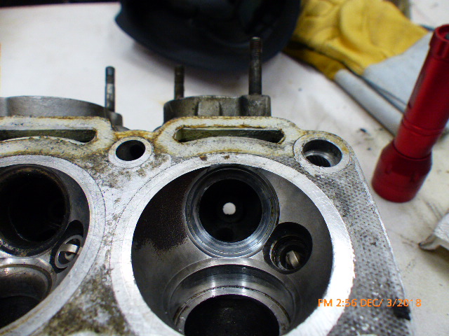 This pic is combustion chamber #1 with both seats out. You can see (hopefully) the nice clean counter bore for the exhaust insert to be placed in.