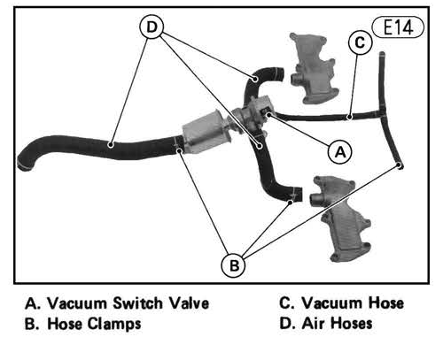 On the U.S. model there is a Clean Air System which includes reed valves in the cylinder head valve cover, a Vacuum Switch Valve, hoses from the air filter box and a vacuum hose from the #3 and #4 intake runners Item "C" in drawing E14 (see below) to operate the Vacuum Switch Valve. (All of this is covered on page 180 of the Service Manual.) Your bike may have the Vacuum switch valve removed and instead of just blocking off the vacuum ports on #3 and #4, the previous owner probably just installed a connecting vacuum tube to the nipples on #3 and #4. You can just leave it, or better yet, remove the vacuum tube and install vacuum port rubber caps on those 2 vacuum nipples.