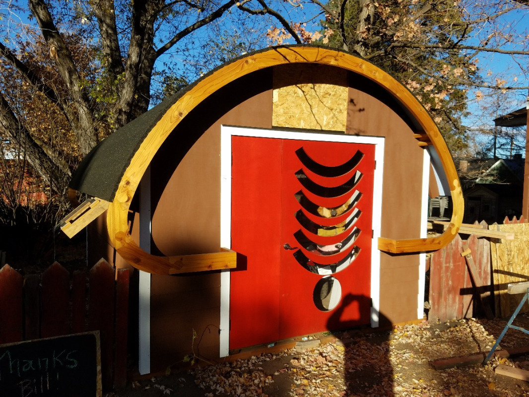 Yes I've made some headway. I don't have a picture that's really current but here you can see it mostly sided and painted. Since I took this pic I have finished the last few pieces of siding that are still missing. I've also installed a small solar collector to run some LED lights and charge an occasional bike battery. The openings in the door panel are actually covered on the inside with a very clear plastic sheeting.