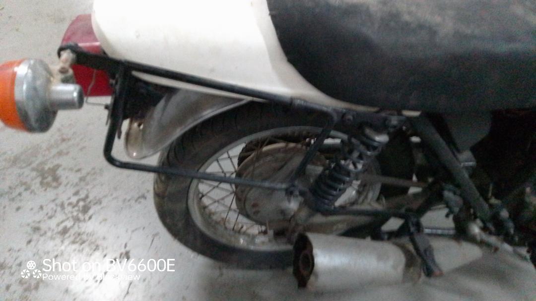 It is a completely white motorcycle, the fenders and ducktail are made of white plastic and it has pannier racks on the back.