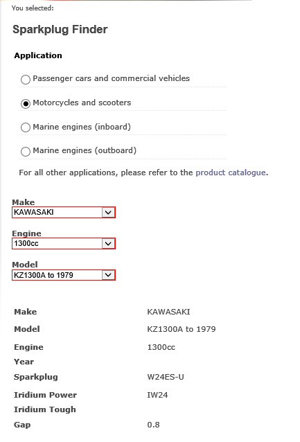 , I have Iridium plugs (BPR6IEX) in the bike at present, they've been in there for quiet a while now, I took them out the other day and cleaned the build up on them as a set of carbs I had on it were running rich for a while, I changed carbs and fuel economy is better ... blah blah blah .... anyway I was thinking of putting new "normal" plugs in, so I had a look at some NGK BPR6ES (pretty sure it has the screw cap???) which i'm pretty sure are the plugs to suit the 13, please correct me if i'm wrong, then I thought about putting Denso plugs in it instead of the NGK, went to the Denso site and put in the make and model of the bike and it gave me a Denso plug W24ES-U (this has a heat rating of 8 in NGK), can someone please do a list of plugs suitable for a 13 in different makes of plugs ??, or is it ok to use the recommended Denso ones or the ones they say are the same as the NGK plugs ???, Please someone let me know and maybe others who are as confused as I am , thanks in advance ... Pete.