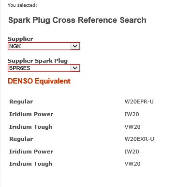 The Denso equivalent to a BPR6ES is a W20EXR-U from what I can find. It would take a lot of talking to get me to change from NGK.