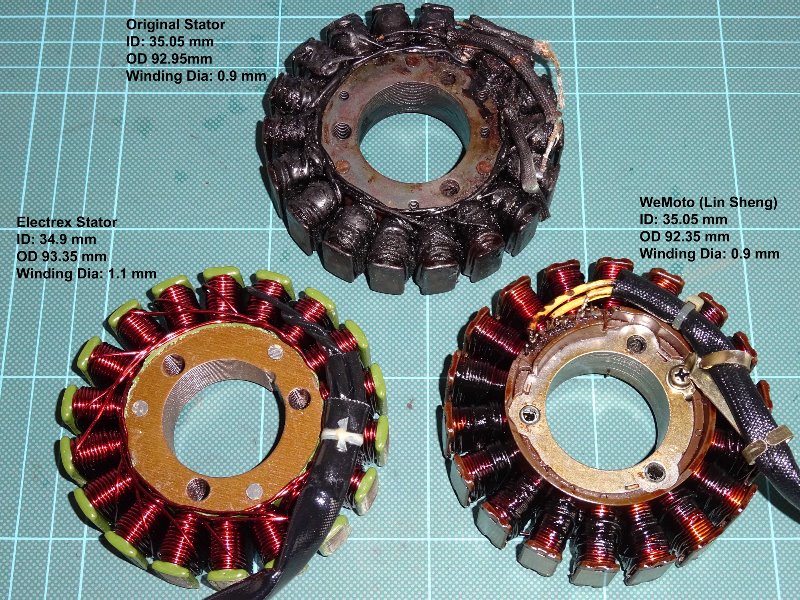None of these fixes seem to solve my problems so after the third failure of the stator type shown bottom right, I bought a more expensive version from Electrex, bottom left in the picture. This differs from the cheaper version in that it does not have soldered fly leads (like the original fit) and I also measured a slightly larger winding diameter - increasing the diameter from 0.9mm to 1mm does not sound a lot but this increases the cross sectional area of the wire by about 20% which means 20% less I*2R heating losses for a given output voltage. The inner diameter of the Electrex stator was a little too small and needed some dressing to fit but otherwise has so far solved my charging problems. The cheaper stators may be OK with the later models with the oil cooling jet but I suggest that all A1 owners avoid this type of stator.