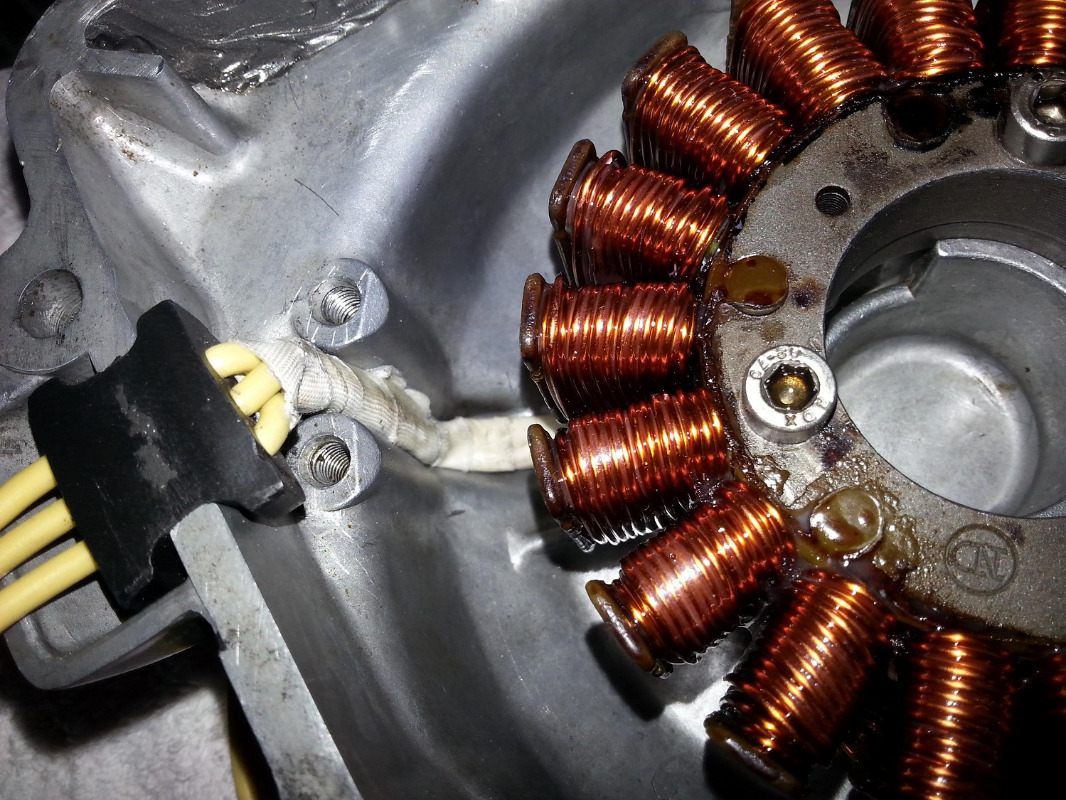 My generator stator burned out, obviously shortly before the weekend, so the only way to fix it quickly was to rewind it my self. I couldn't find any info readily available so I post one now. Quick check in the box with my old tube amp building materials, copper wire is there, some isolation tube and fiberglass tape so I was ready to go. I've made a measurement of the winding and they where well out of spec, or better to say complete out of space. After dismantling alternator cover it was instantly clear (from the smell of it) that the winding insulation was gone. First step was to strip old wire of the stator poles and clean everything, also sanding down any sharp edges on the stator posts. The job is not very inviting but its got to be done, and of course counting the turns is vital. 37 turns pro post, wire thickness 0.9 mm without the insulating lacquer.