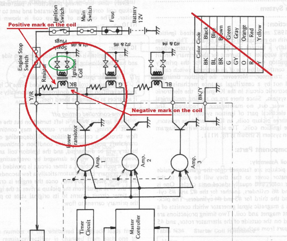 Hi Nero, to answer you question, if I understand correctly You mean which polarity goes where on the coils primary connections, that's what I presume. Look at the schematic below: Positive from the battery goes through the chain: Fuse, Main switch, Ignition switch, Engine stop switch – to the resistor and so it brings the positive to one pole on the ignition coil primary and the other pole from the coil will be automaticity negative (which goes to the igniter).