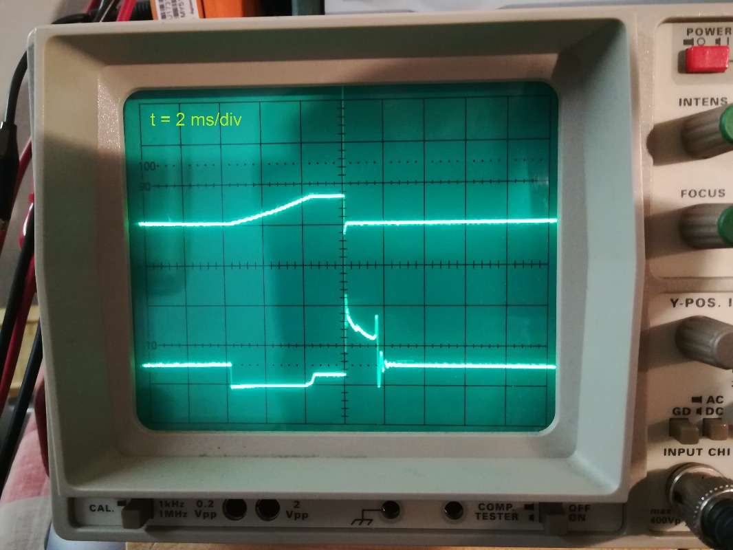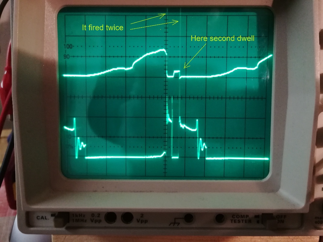 . So after getting over the disappointment i started to look at the problem ahead of me in more theoretical way, because it was clear with out it there will be no new ignition i so desperately want it to have. After looking at the trace i suspect, there is no current control on this unit because current draw is gradually rising with no indication of something taking any action visible on the trace. The unit charges the coil with: I=U/R, I=0.4V/0.05 Ohm = 8 Amp. After i added 1 ohm resistor in series with the coil current dropped to 5 Amp at the engine speed around 500 rpm maybe. Second thing is that up on sudden acceleration it skips one pulse as the result engine develops noticeable stumble, like when the idle to mid range lucks fuel. And so it was Game Over for Hella for me, because i have expected more from such old manufacture, oh well.