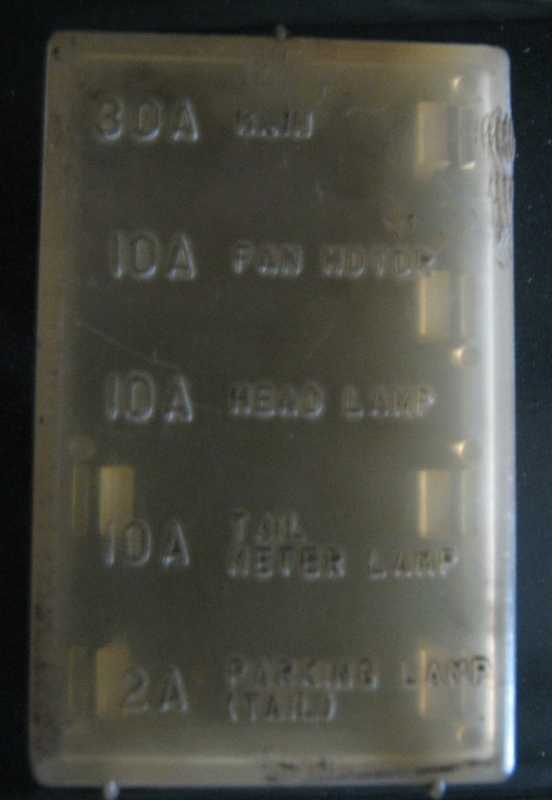 From the Right side to the left side: 30A Main, 10A Fan, 10A Headlight, 10A tail light, 2A Park lights. The correct length can be bought on Ebay. I had no luck finding an automotive supplier that carried the shorter size.