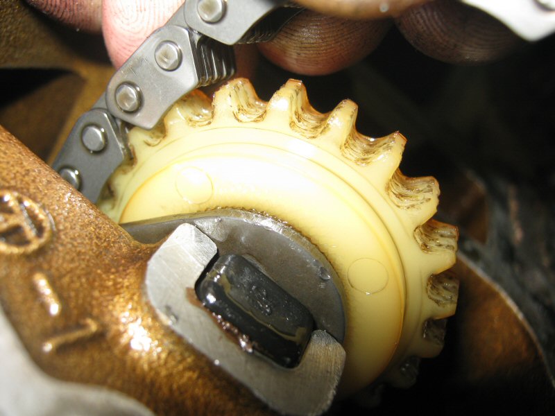 Hi all, well i'm on my 4 weeks annual vacation here in sunny Queensland Australia, so a good time to pull the head off and change over the cam chain cog to the new metal one I got a while ago, also did the valve stem seals while the head was off. It went reasonably well, only dropped one little thing down inside the motor, one of the little rubber blocks on the idler cog shaft end, hate doing the valve stem seals as I always have trouble with the collets, anyone got a good tip on how to do them easily or a photo of what valve spring compressor you use ??, I made up a bit of a crap one, does the job but not easily, anyway the old cog has been in the bike for a couple of years now, probably for 15 to 20 thousand kilometres, and with the replacement tensioner from the 1100 (or what ever it is)with the spring cut down, i'll add photos, still have to check the shims, put it all back together and run it and re-tension the head bolts, also if anyone wants to see the timing on the cam chain i'll add a photo of that. Ok fingers crossed all continues to go ok, can't handle too many stuff up's. getting too old and shaky for this again, cheers Pete.