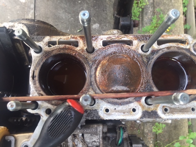 HOWEVER, that particular block and set of pistons was beyond salvation, so I chucked those and bought a second hand block from US, and those pistons are the ones on the left here - compared with the new ones that you think are from a Voyager on the right.