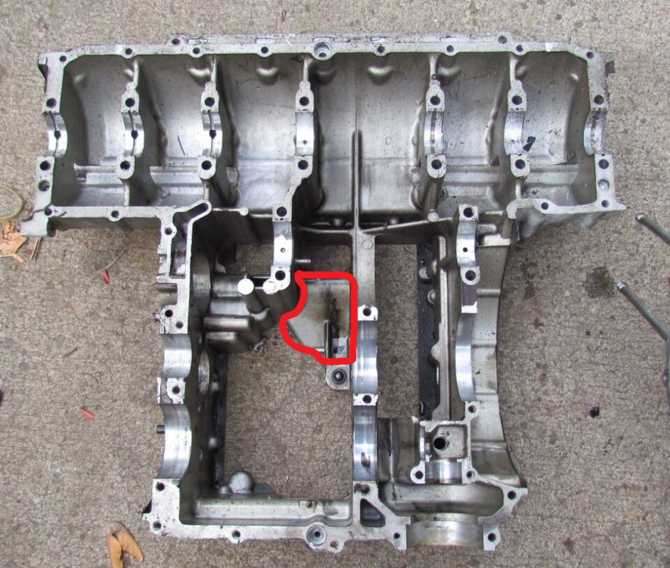 The only possible accommodation in the oil pan with direct drop from the top of the block is marked in red.