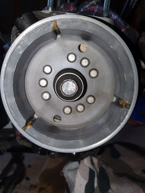 Update on the generator rotor. Advice from auto electrician was, do not try to remove magnets, "you will never get them back on ever!!!". Recommended a tidy up and use a good expoxy resin to the areas necessary. So removed the remaining bits (first photo) and was very tempted to stop there given first couple of photos on page 86 of FSM. However all subsequent photos of the rotor in the manual show bond on the edge. Kawasaki frequently changed/upgraded parts even within a given model year (as I found out when restoring my '73 Z1). Checked part numbers and rotor had same number for A1, A2 & A3, 21007-1015 but this changed to 21007-1048 for A4 & A5. May not mean anything but I decided the bond on the edge was probably there for a reason - oil less likely to be caught on lip of rotor and work between magnets and casing? better oil flow? don't know. Anyway decided to break out the JB Weld and tried to replicate (second photo). Time will tell.