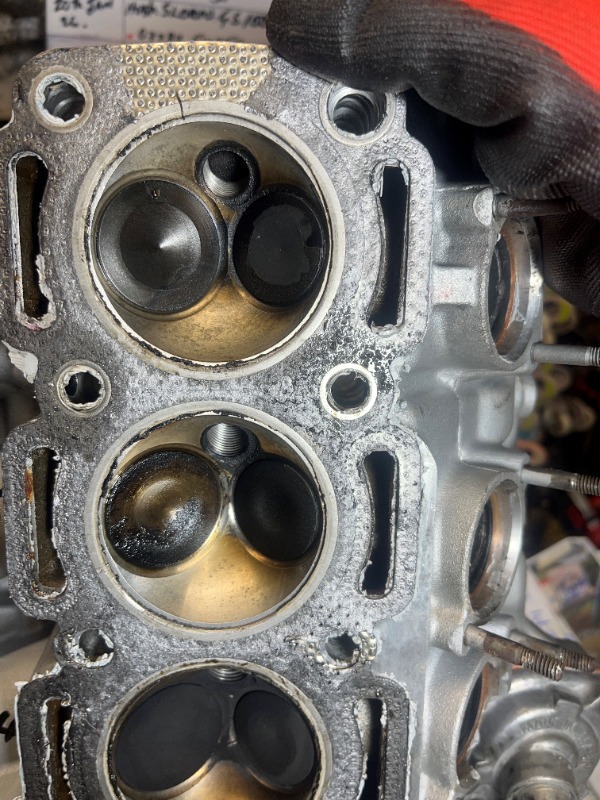 A couple of thoughts here. Looking at the pic i see carbon build up on the center intake valve and on all 3 squish band areas inside of the fire ring on the head gasket. I'm going to suggest that if you look at the back side of that center intake valve, you're going to see wet carbon build up on the back side of the valve and that's a sure sign of oil being sucked in from the valve stem. Even if the valve stem seals are subtle, if the valve stem to valve guide clearance is excessive, the valve will wobble in the stem and allow the oil to creep past the seal. Bear in mind that under most riding conditions, the intake tracks are under a vacuum and the oil is going to follow the path of least resistance and get pulled into the intake.