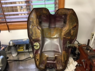 My problem is the fuel tank. The seller had the tank off when I bought it, which shouldn't be a problem, right? Well, I'll be hanged if I can get it back on there. I finally involve my wife, the math teacher (and pretty good mechanic) into things and she feels the underside of the tank does not align with the frame. Ah, Geometry.
