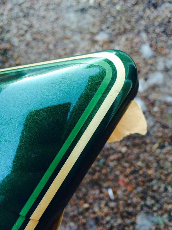 Here's a picture of my NOS A3 side cover. I do agree a lighter green stripe would be nicer than the pale looking green found on the bike originally. Thanks for adding the picture Holger. I now know for sure I need to paint one in A3 green.