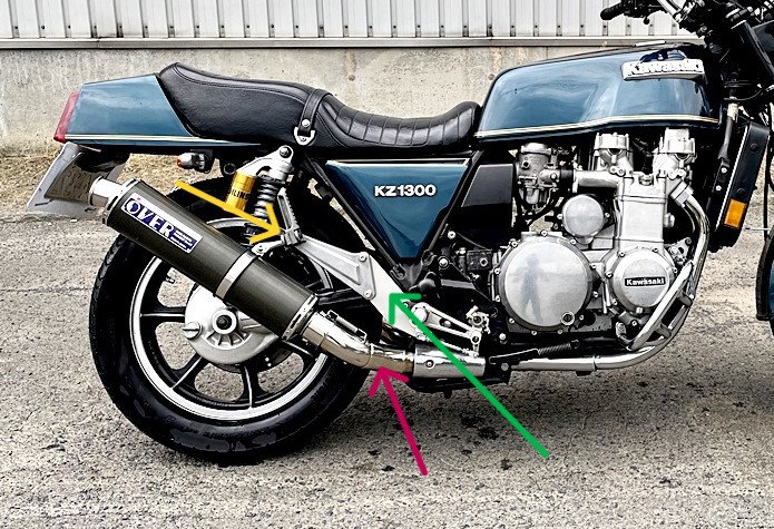 The green arrow indicates a plate made for this purpose to hold the original passenger footpeg support.