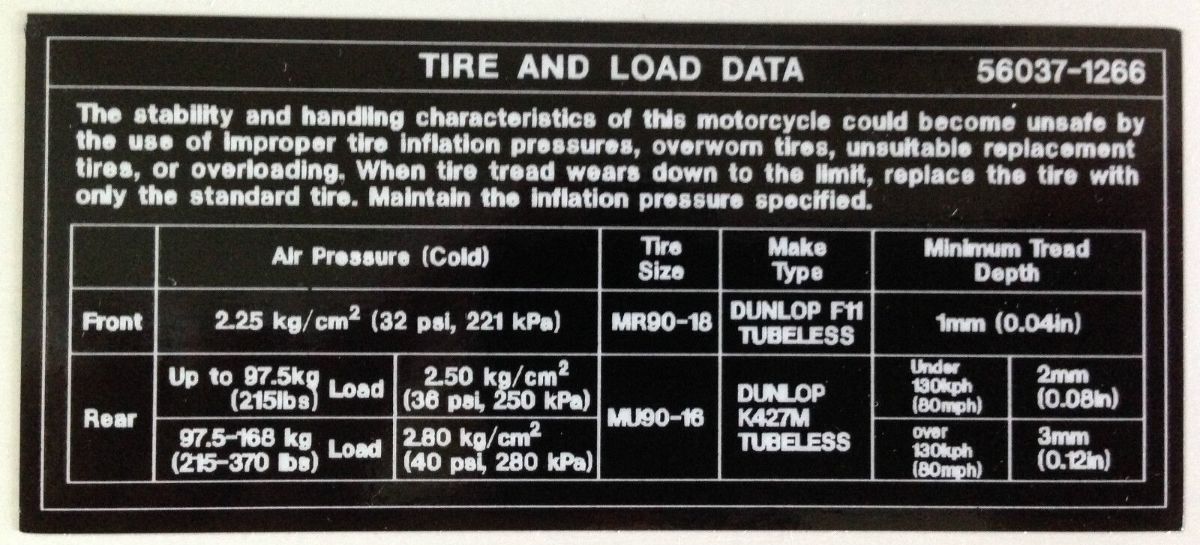 but looking at the pressures on this label I "suspect" that this is a reproduction of the ZN1300 Voyager label since the pressures noted on the label are slightly higher than the pressures quoted in the Owner's Manual for the 1979 KZ1300.