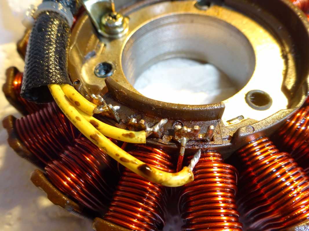 This is the stator I fitted 8 years ago which failed recently - oil pyrolysis evident on the stator coils and solder melted from the fly lead connections