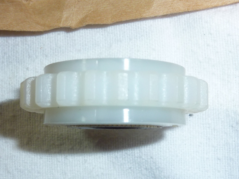8 years 5 months agoscotch wrote: If a Steel gear is out of your budget I wouldn't hesitate to use the plastic gear, shown in photo. Yours has lots of life left. Mine - 1980 - 80,000Kilomemters is worn down significantly more then the one in the photo - still adjusts with a manual tensioner, is quiet and will stay in until it HAS to be replaced. The grooves would be from the chain-links.