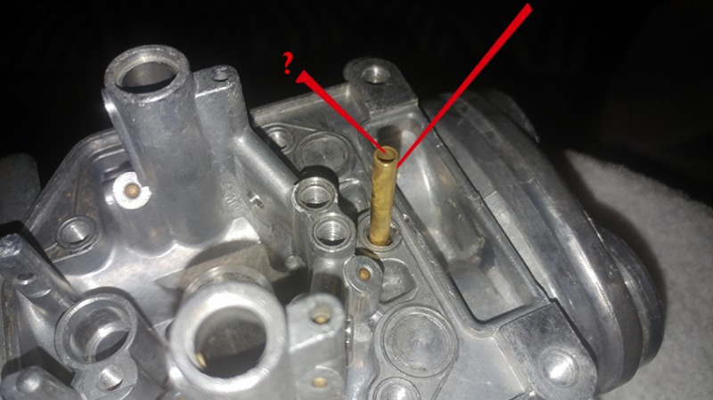 I've seen this quite a few times. Seems to be common. At least with the sets I've bought and rebuilt. The reason the tube cracks, I don't know definitively but expect it's because at some time during the life of the carbs, they've had water in the bowl(s), it's frozen inside the tube - cracking it. I prefer to slip another piece of brass tube over the existing. Whether a "short" collar for the end or full length - this needs to be addressed. Either way - Clean the pick-up with some "Scotch-Brite" ( No pun intended). Solder carefully. The metering jet that's missing is about .024" and should be replaced BUT - there is a similar metering jet in the bottom of the pick-up well (in the bowl) so you might be OK with just the one. Why there are two, I can't explain.