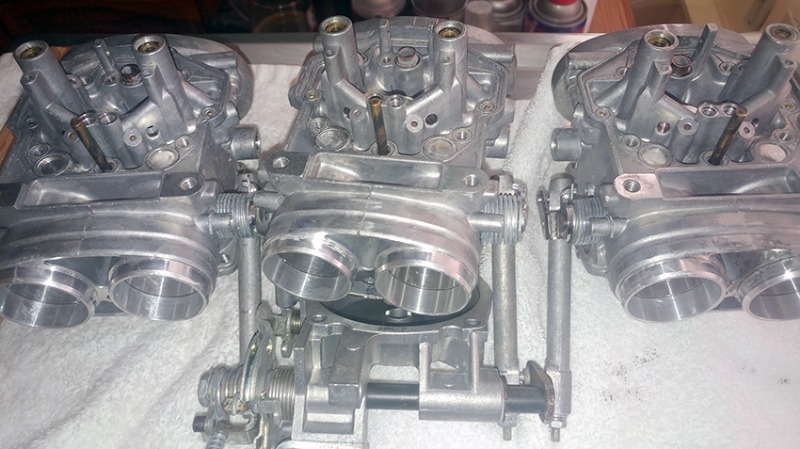 The carburetors after preliminary cleaning. Next I will remove all the little bits and give it another ultrasonic bath.