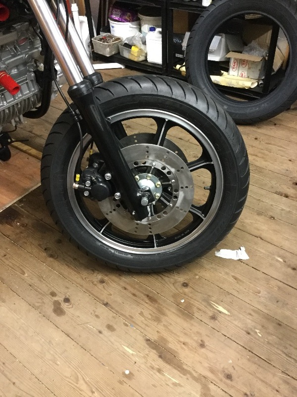 A bit more progress this week with the front wheel painted and new tyre fitted. Brake calipers installed and all bled. Surprised how easily they bled as I’ve had problems with other brake systems I’ve restored in the past. Was going to fit the exhausts tonight then remembered I’ve forgot to order new seals for the exhaust header to collector box. Hopefully they’ll come before Christmas. Decided to have the collector boxes ceramic coated. That should keep the rust at bay for a few years.