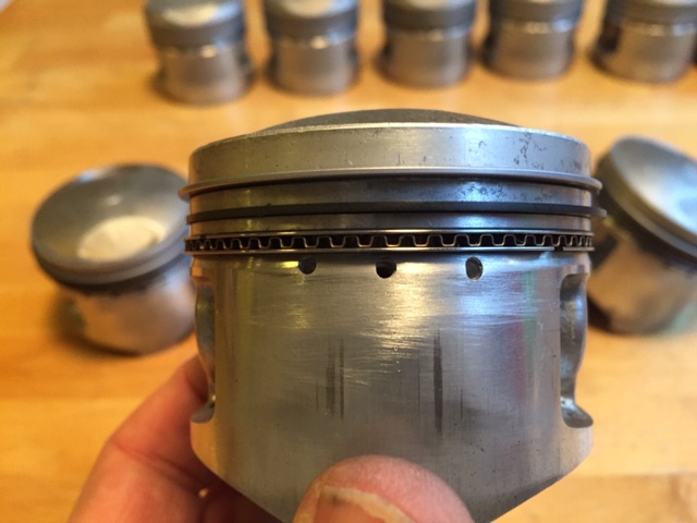 One thing I'd check before installing the pistons is their weight. Just like connecting rods, which are stamped according to their weight and the engine should have all of the identical, pistons should have a very close weight as well for balance. If one has 10 holes and the other 6, that's a difference of 4 holes missing material. I wonder what difference would this make in weight. I'd shave off some weight of the heavier ones to be closer to have all of them equal.