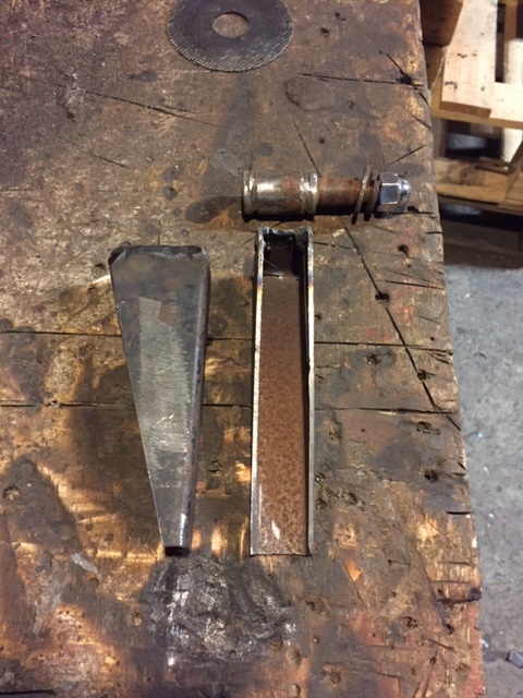 I lucked out and found a piece of double walled metal in the scrap metal skip. I cut two triangles out and folded and welded up the 'top lip' to give it extra strength. These will hold the original shock mounts, once I have drilled a hole and welded them in.