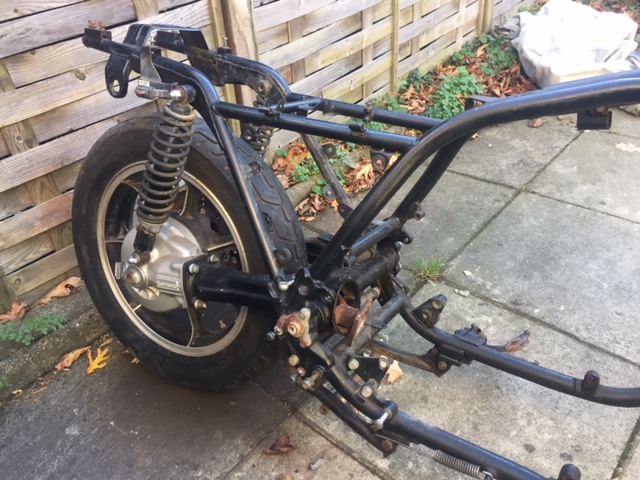 The frame is in excellent condition, but depending on what the final product needs to look like, be stripped of all brackets that are no longer needed, and other bits may be cut off/welded on. I am currently thinking of fitting Ohlins upside down front forks with uprated brakes, and depending on the length of the forks and the new arrangement on the rear suspension, may need to adjust the triple tree arrangement.