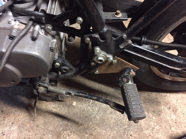 So I took the aluminium rear peg and exhaust supports off and fashioned a mock-up bracket to try it out. The seating position is now great, but here is what happens if you start messing with the standard design: