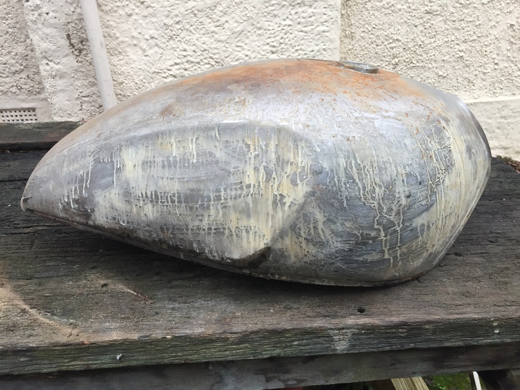 I took the tank home as it was getting rusty at the mill where I work (and where I have the welding equipment). I sanded it down today and clear-coated it to prevent further rust. Looks quite cool... but doesn't fit my vision, so will get painted later.