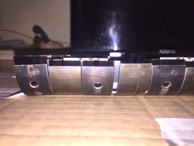 Main journals: I think I had a moment of miscommunication speaking of conrods not main bearings. The con rods bushings have no markings, the main journal bushings have as well. Quite interesting to see yours are all D9D. Here what mine say: D0D, D0B and D0A.
