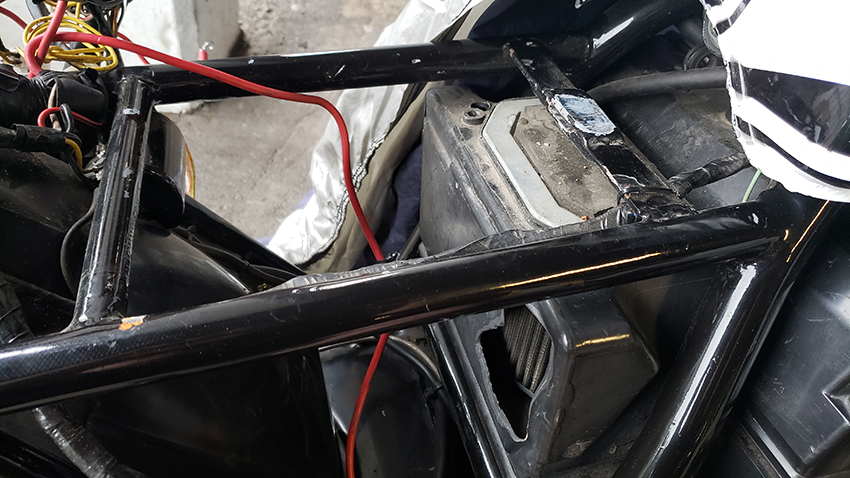 It's shoved between the fender, the frame and the ignition container and taped the with electrical tape. Just to get that tape out of the way wasn't easy!