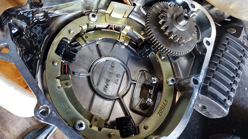 The left cover is off. Superficially all looks good. I am going to replace the starter with a spare starter I have already serviced - ready to bolt and go! I will service the removed starter and it will go on a shelf as a backup for my two KZ1300 now.