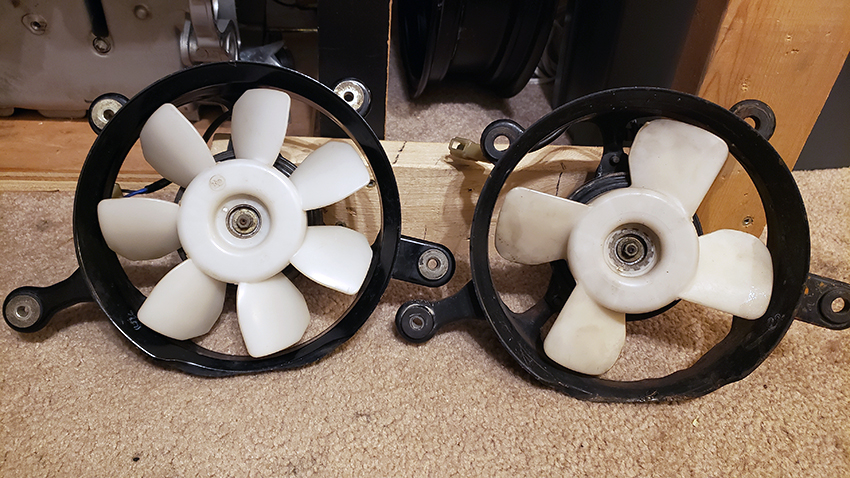 The original fan (on the right) is going to be replaced with a six blade fan I have and have been keeping to install it on the A4. But what the hell. I can always swap them in the future if I still want. The A4 is running cool, so there is no real need for it. It will be good to have two KZ1300's side by side and being able to compare how they work!